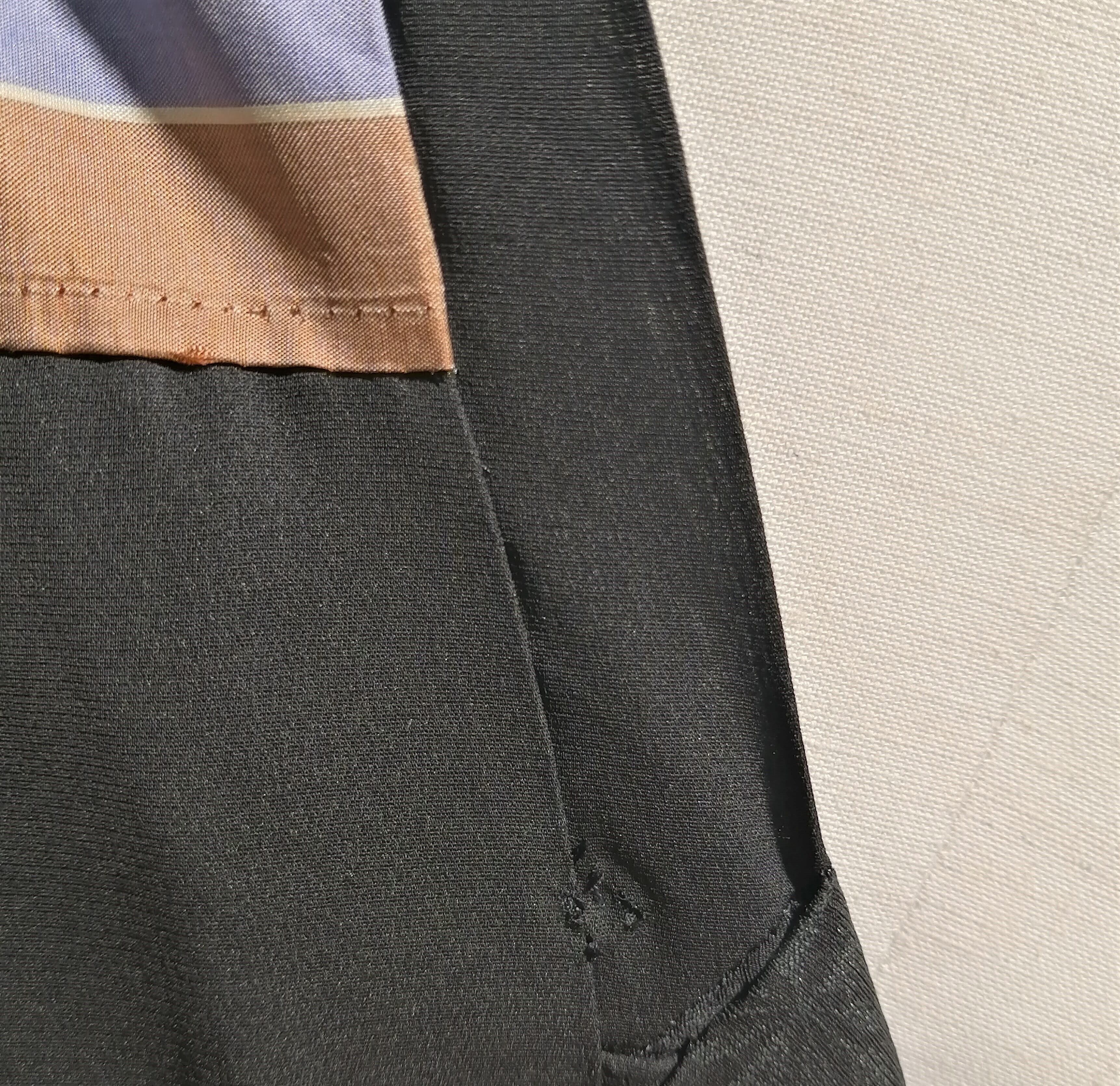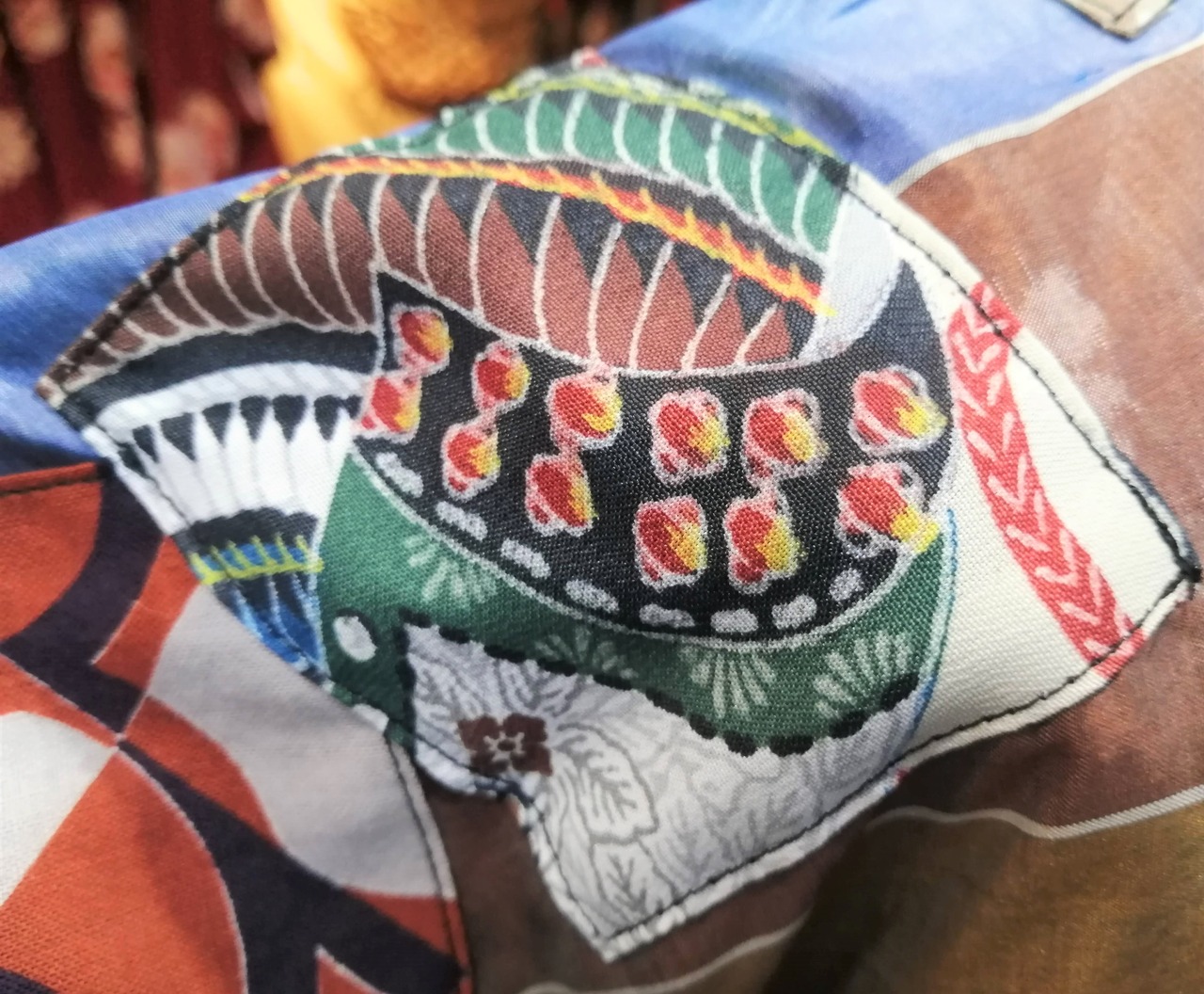 黒いコートの裏地にビンテージの生地を縫い付けています。