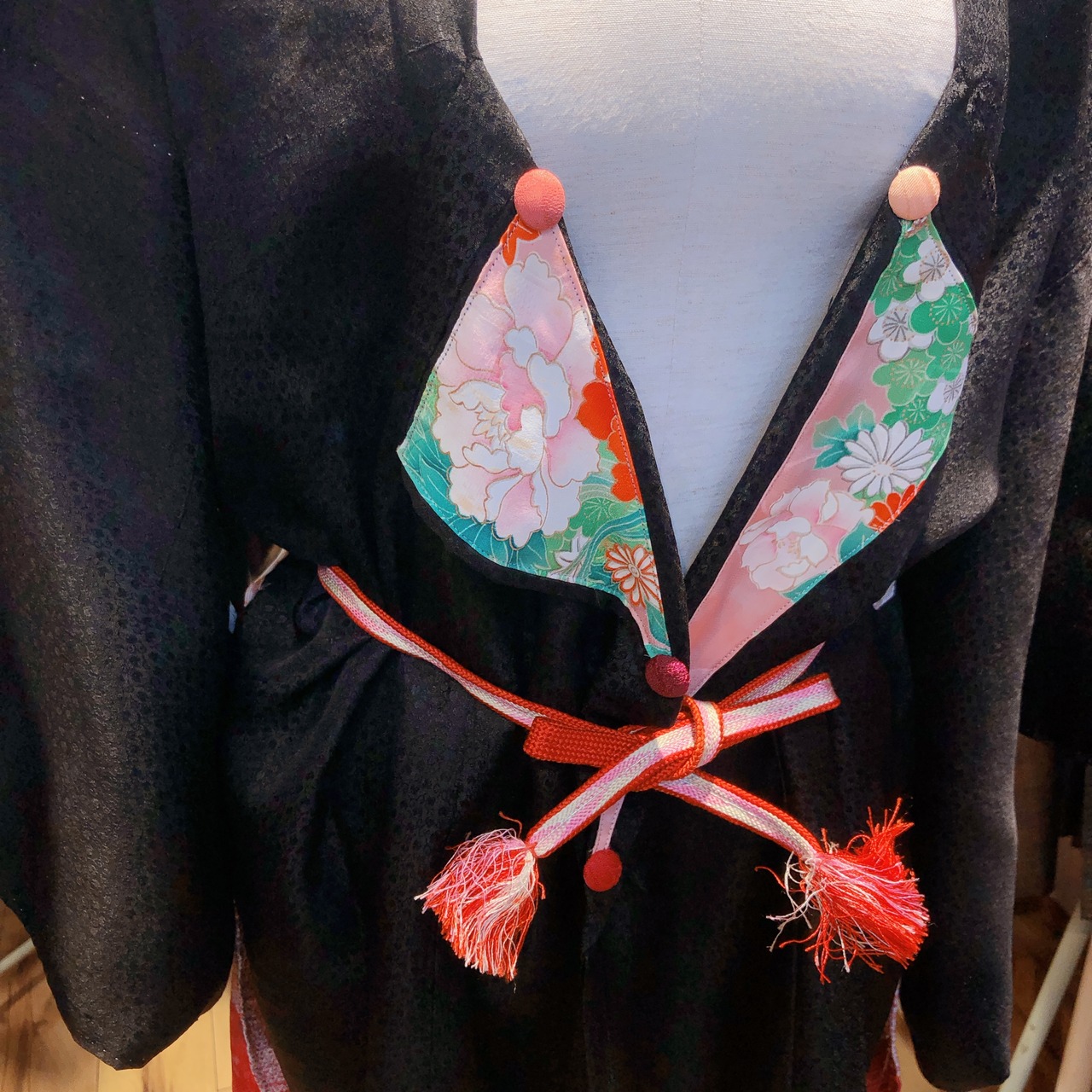 帯紐できゅっと結ぶとシルエットがよりかわいくなります。